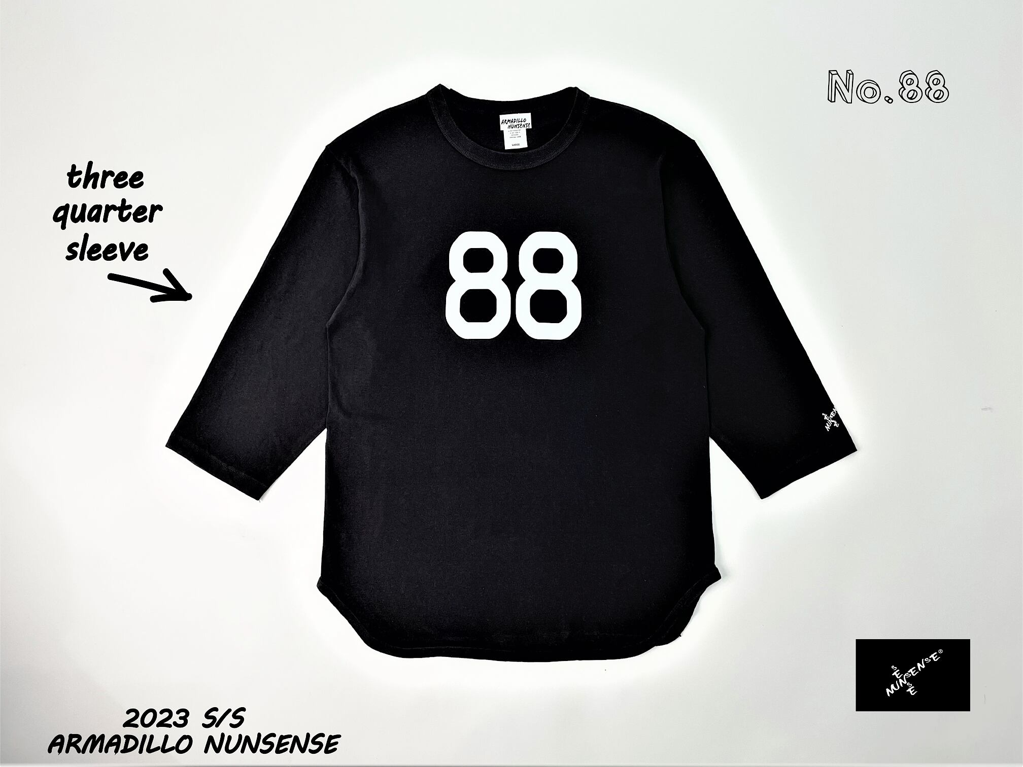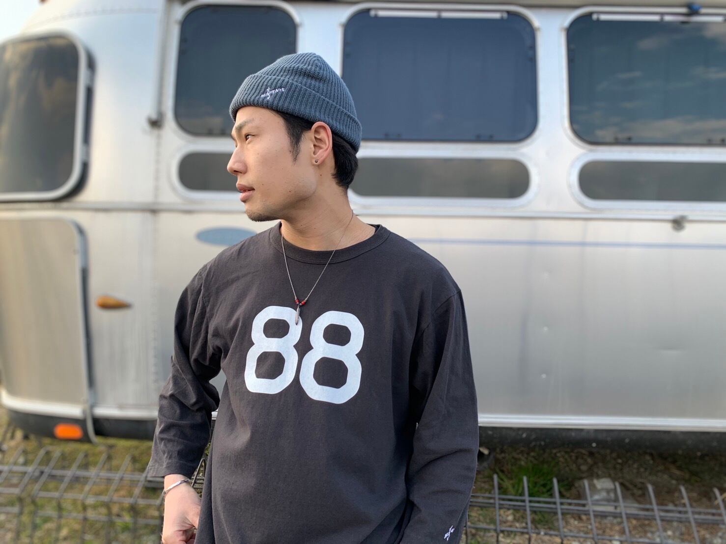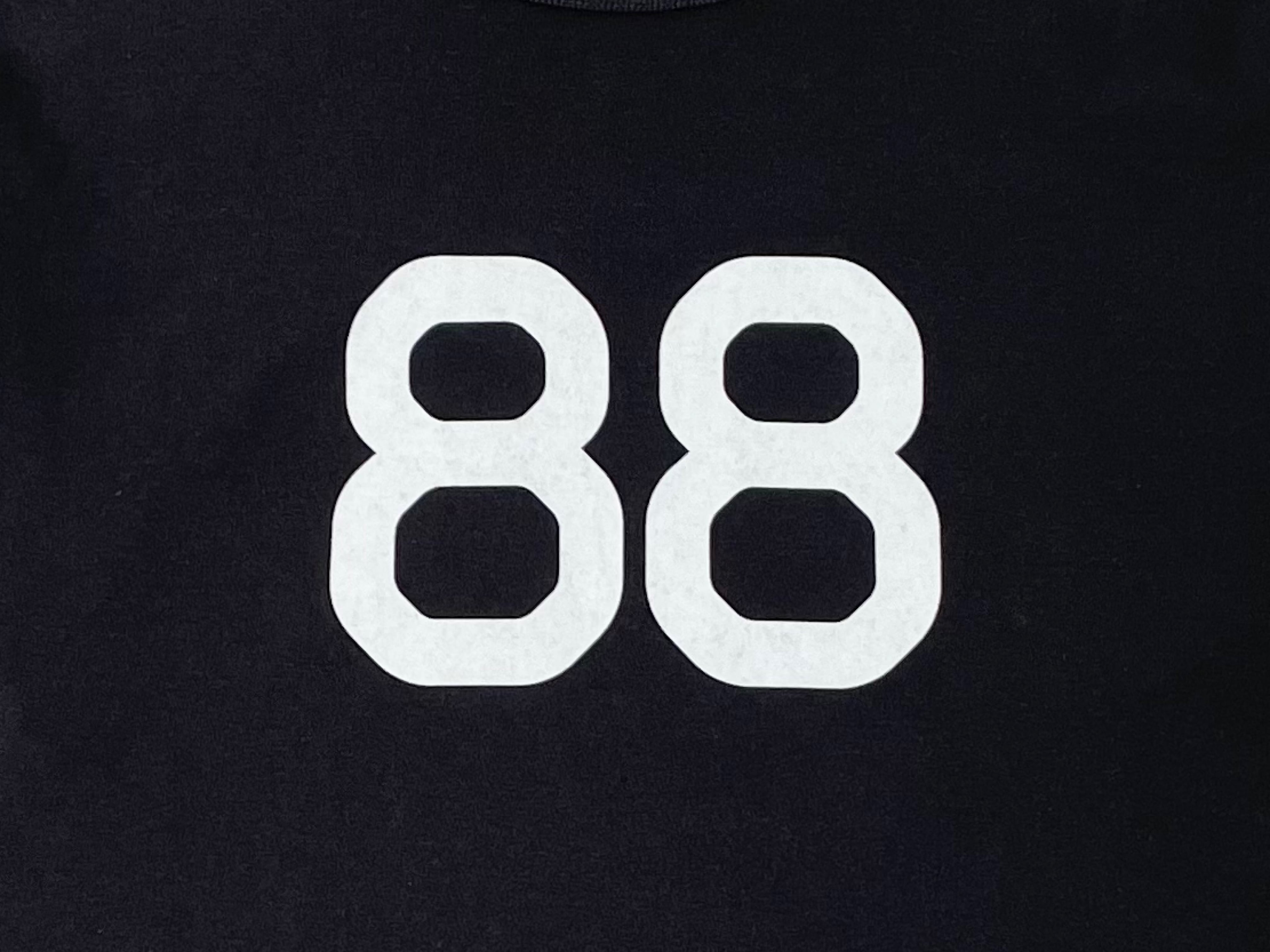 フロントには末広がりで縁起のいい88をフロントに配置。袖口にはブランドロゴ。裾の広がり方もベースボールシャツを思わせる、1枚でもシャツやアウターに忍ばせても良しな優れモノ。